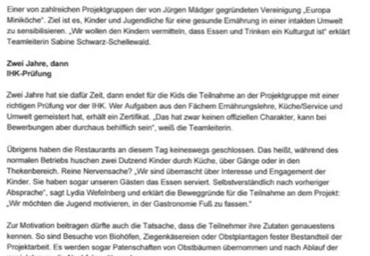 Den Projektinitiatoren und –begleitern gilt an dieser Stelle mein besonderer Dank. Sie haben das Interesse der Miniköche an der Gastronomie geweckt, ihnen zusammen mit zahlreichen Gastronomen das Berufsfeld nahe gebracht und damit einen wichtigen Beitrag zur kreativen Freizeitgestaltung und möglicherweise sogar zur Berufsfindung geleistet.