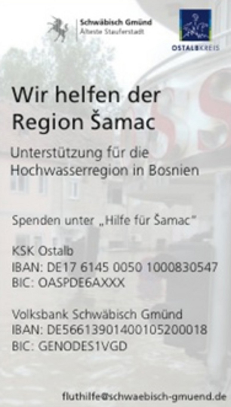 Unterstützung für die Hochwasserregion in Bosnien, in der Nahrung für Kinder sowie Pumpen gegen das Hochwasser benötigt wird